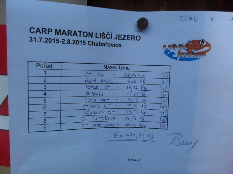 Celkem uloveno: 965,85 kg kaprů a amurů Největší ryba závodu CT Litošice 9,56kg Všem týmům děkujeme za účast, dále děkujeme rozhodčím za super práci. Výhercům děkujeme za krásný souboj o každou příčku a budeme se těšit na další ročník roku 2016, který pro vás jistě připravíme. Všechna zdraví Martas