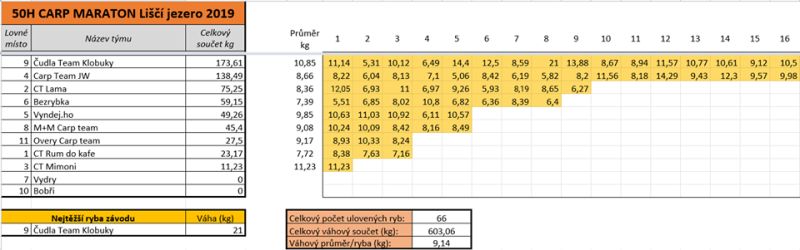 Tak i tentokrát se závod 50 hodin, docela vyvedl. Chválím všechny za dodržování pravidel a ohleduplné chování se k rybám. Co jsem navařil se snědlo, co bylo k mání se vypilo i počasí se nakonec umoudřilo. Ještě dodám fotky z vyhlášení. Více foto a info najdete na facebooku v onlinu, je to jak na "liščí jezero" tak na "carpmaraton liščí jezero". Ještě .. výsledky jsou ve fotkách i kolik se nachytalo, já jen doplním, že nej ryba byla o váze 21 kg a je ochipovaná a sledovaná už od roku 2015 tenkrát při prvním označení měla 15 kg. Všem moc děkuji za účast a těm co se umístili gratuluji. Aleš D.