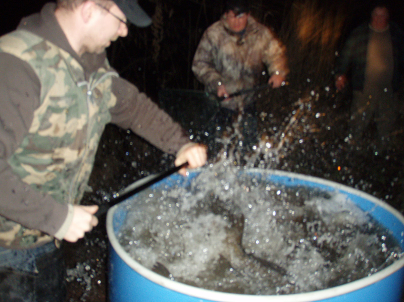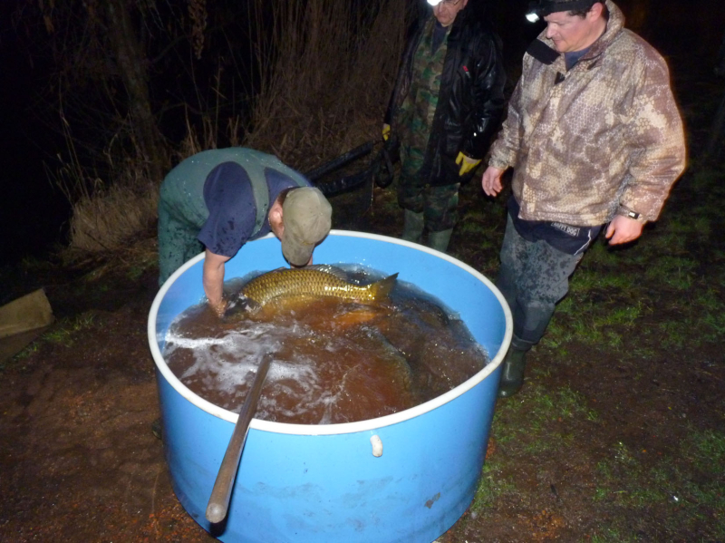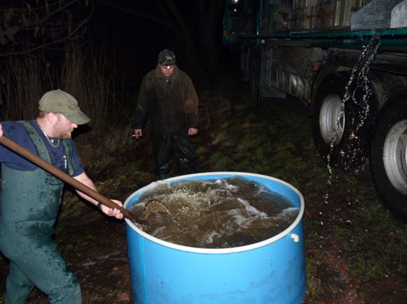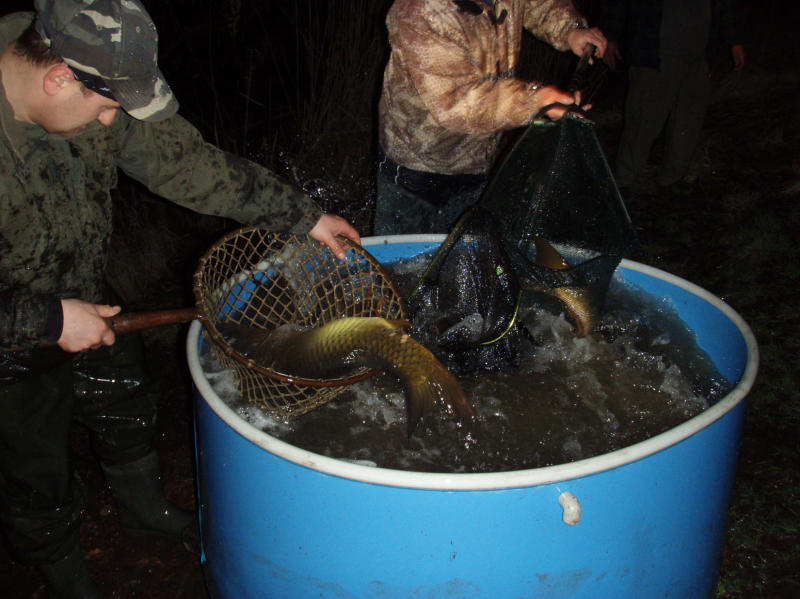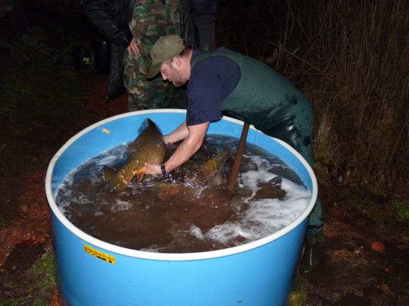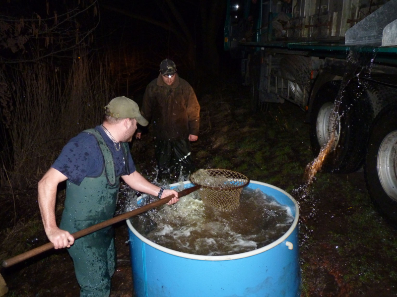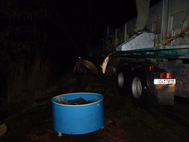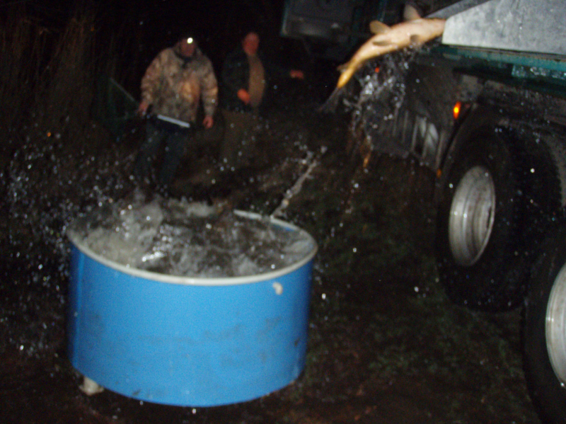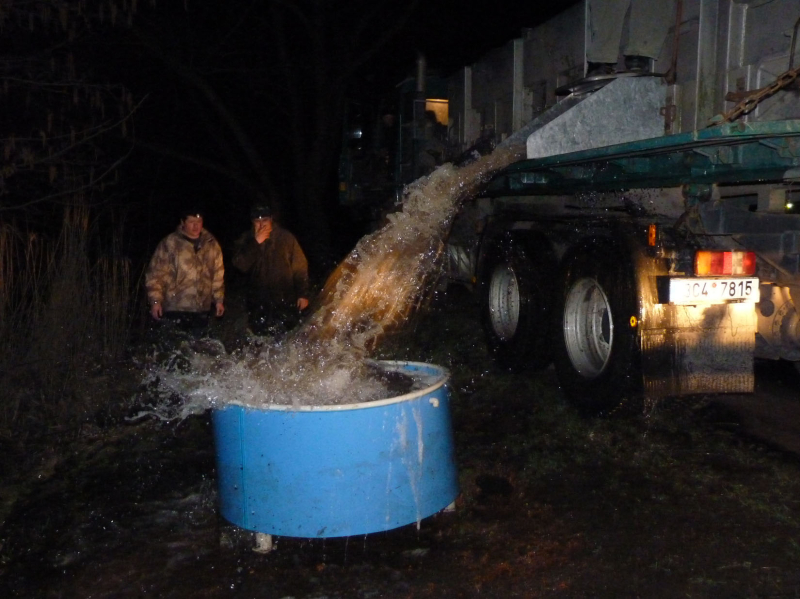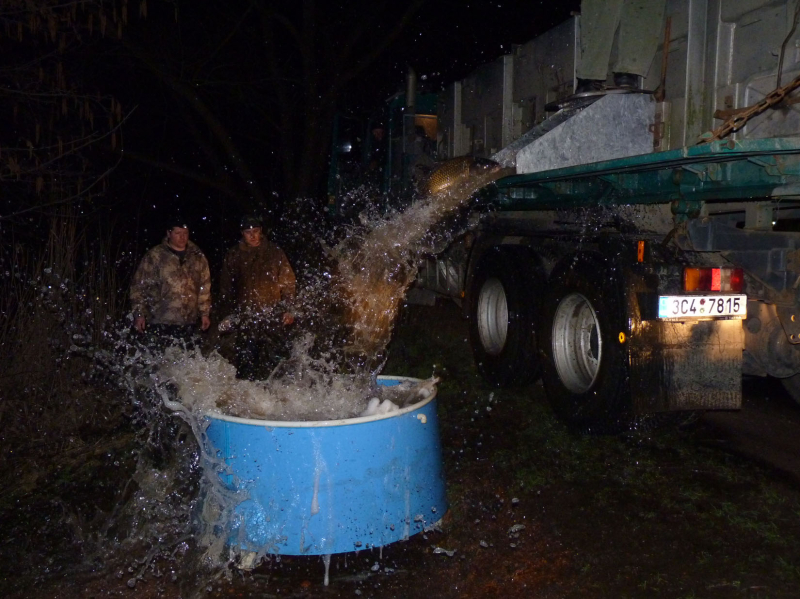 . . . a konečně ten den přišel . . . je 4:00 a já popíjím s ospalými kamarády v kanceláři kávu, natěšení debatujeme o tom co nás čeká a pak . . . pak jdeme připravit nezbytné pomůcky a náčiní s člunem, potřebné pro vysazování ryb. Před pátou ráno dojíždí k rybníku plně naložená tatra z rybářství Hluboká. Netrvá to dlouho a první šupináči s váhou mezi 6 a 14 kg ochutnávají svůj nový domov. Vše běží jako na drátkách a práce se daří jak má a po vypuštění 4. nádrže namáhavý a mokrý job končí. Společně s kapry zásilka z Hluboké obsahovala také 150 ks štiky (60 -75 cm). No trvalo to asi dvě a půl hodinky a i poslední šupináči byly dopraveni bezpečně do svého nového a bezpečného domova . . .